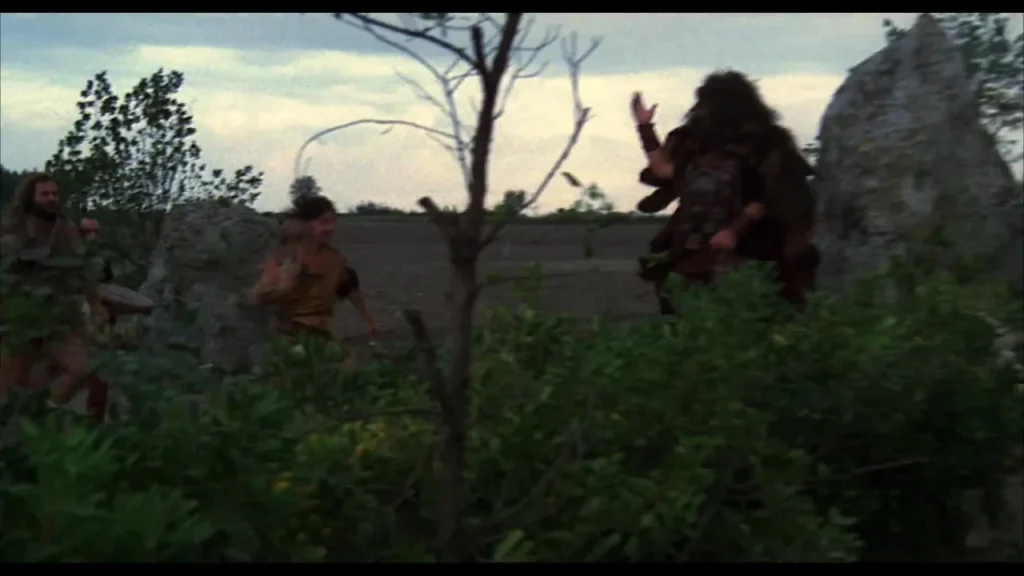 Guy in a fur cape and brown curly hair, looks like a Viking or some kind of warlord, standing in a field holding a sword. He’s got a thick mustache and a solid build — looks mid-30s. Redheaded woman, slim with curly red hair and bare tits, standing in water outside. She’s wearing gold bracelets and just standing there, not doing much. Three younger muscular guys running around a field like they’re in battle or some reenactment. Then it cuts to an older guy, gray hair, thin, in a white toga, sitting in what looks like a classroom with desks. He’s holding a whip. Scene feels like some weird historical porn concept with no actual sex shown in these frames. More costume drama than fucking, but maybe the full video gets graphic later. Camera work is static and wide in the outdoor shots, close-ups on her tits and his face. Not much action happening here, just setup.