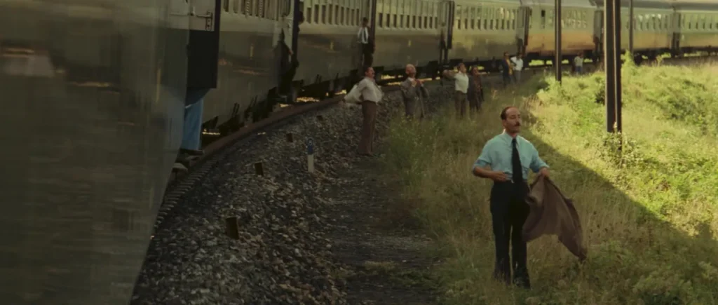 A mature woman with long dark hair is bent over in a wooden wheelbarrow in the middle of a field, dark storm clouds overhead. She’s completely naked, facing down, her ass raised up as a guy from behind pounds her hard from behind in doggy style. You can see the rain starting to fall, making her back and ass glisten while he grabs her hips and slams in deep. The camera stays wide the whole time, no cuts, just raw continuous action with natural light and the sound of thunder rolling in. Later frames show different outdoor scenes — train tracks, a military tank, a lone tree — but the wheelbarrow scene is the main one with actual sex. Feels rough, kinda desperate, like they’re trying to get it done before the storm hits full.