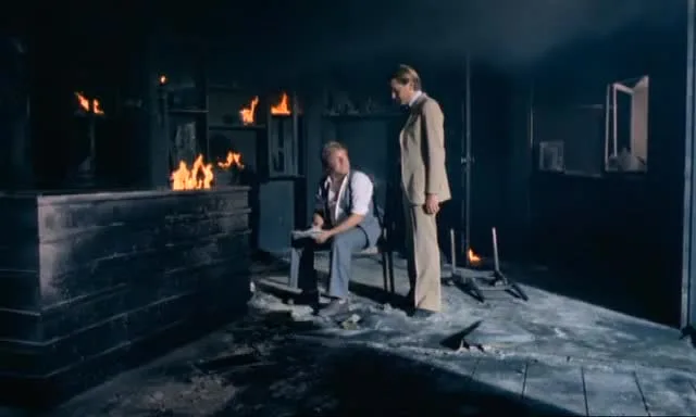 A mature blonde woman stands in a garden with flowers, a fountain, and a gate behind her. She’s wearing a white top, back to the camera, not doing anything sexual. Later, two men in military uniforms with dark and grey hair are seen inside a dim room, standing near a table with sashes across their chests. They’re not touching each other — just facing each other like they’re in a meeting. Another scene shows two men, one with dark hair and one blonde, sitting and standing near a burning fireplace inside what looks like a collapsing building. Flames are high, debris around, but again, no sex, no contact. There’s also a brief outdoor shot of three people running on a street between buildings in daylight. Nothing explicit happens at any point. The video focuses on atmospheric scenes — garden, urban run, fire, military room — with no nudity or sexual acts visible in these frames.