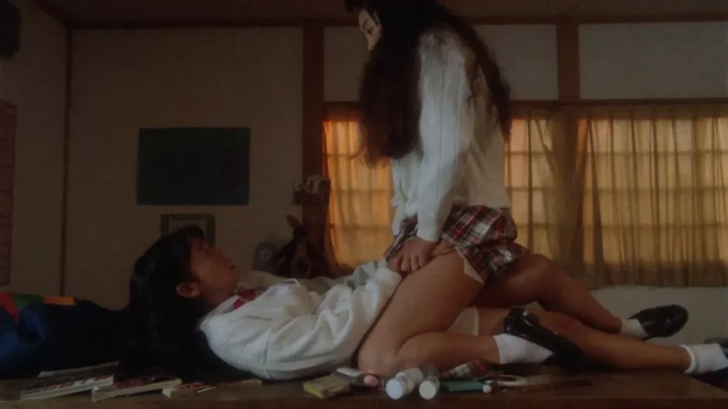 One of the girls has massive fake tits that don’t match her tiny frame — they bounce hard when she’s on top during missionary. The other girl is flat-chested but goes wild on the cock, deepthroating with her nose in his pubes, swallowing every inch. They switch off sucking and riding, both take creampie finishes with cum dripping down their thighs. The guy wears a kippah and just lies there, classic Asian MILF hunter vibes, letting the two young things do all the work. Camera stays tight during blowjobs, lots of wet close-ups, then pulls back for wide shots of the doggy style pounding. Lighting is dim but clear, looks like a bedroom with books and a plant in the background.